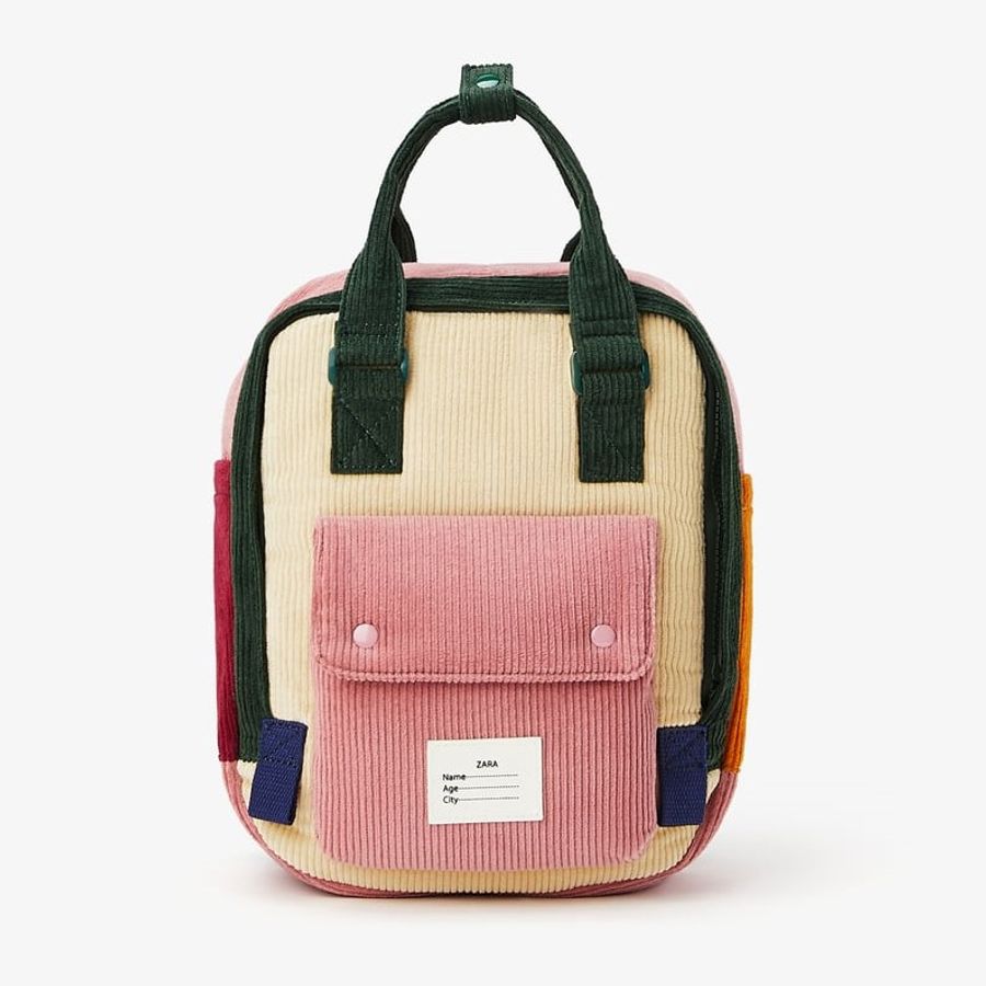 Ba lô Zara vải nhung tăm phối nhiều màu cực xinh xắn, cách phối màu tinh tế, độc đáo. Một ngăn chính đóng mở bằng khóa kéo đựng được rất nhiều đồ cho mẹ và bé. Một ngăn phụ phía trước cài khuy bấm tiện lợi. Có hai quai cầm tay có khuy bấm và hai quai đeo vai phía sau điều chỉnh được độ dài.
