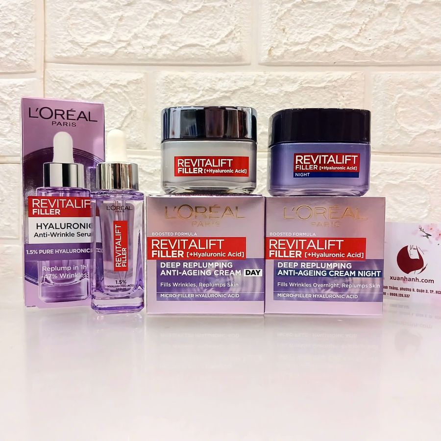 2. Kem dưỡng ngày L'oreal Revitalift Filler Deep Replumping Anti-Ageing Cream - 50ml: Là sản phẩm kem dưỡng da với sự kết hợp không chỉ 1 mà đến 2 loại Hyaluronic Acid ưu việt ở nồng độ cao nhất, giúp hỗ trợ làm đầy các nếp nhăn và tái tạo làn da căng mọng. Bên cạnh đó, công thức kem dưỡng còn được làm giàu với chiết xuất thực vật Fibroxyl có đặc tính làm săn chắc da và làm giảm sự xuất hiện của các nếp nhăn. Với Revitalift Filler - làn da của bạn sẽ có sự thay đổi rõ rệt, trở nên căng mọng, ẩm mượt và rạng rỡ hơn bao giờ hết. Chất dạng kem gel nhẹ mịn, thấm nhanh, không gây bết dính, không làm da bóng dầu.